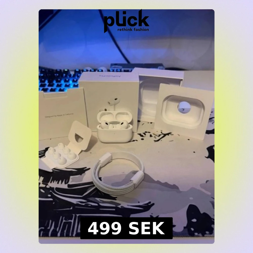 Apple AirPods Pro med laddningsetui, extra öronkuddar och originalförpackning. Produkten ser ut att vara i mycket gott skick utan synligt slitage. Perfekt för trådlös musik och samtal med aktiv brusreducering och hög ljudkvalitet.