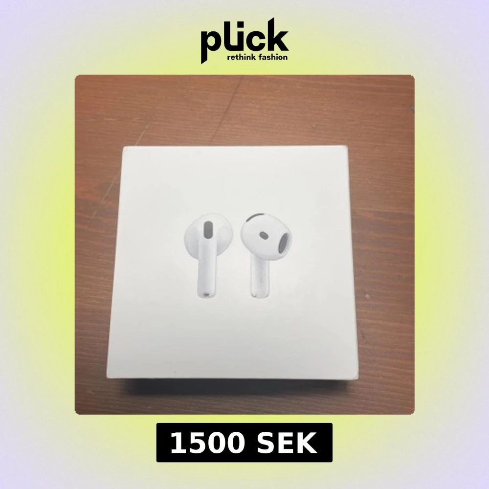 Apple AirPods 4 med laddningsetui. Trådlösa hörlurar med USB-C-kompatibilitet. Produkten levereras i originalförpackning och ser ut att vara i gott skick, endast mindre tecken på användning syns på etuiet. Perfekt för musik, samtal och smidig anslutning till Apple-enheter.