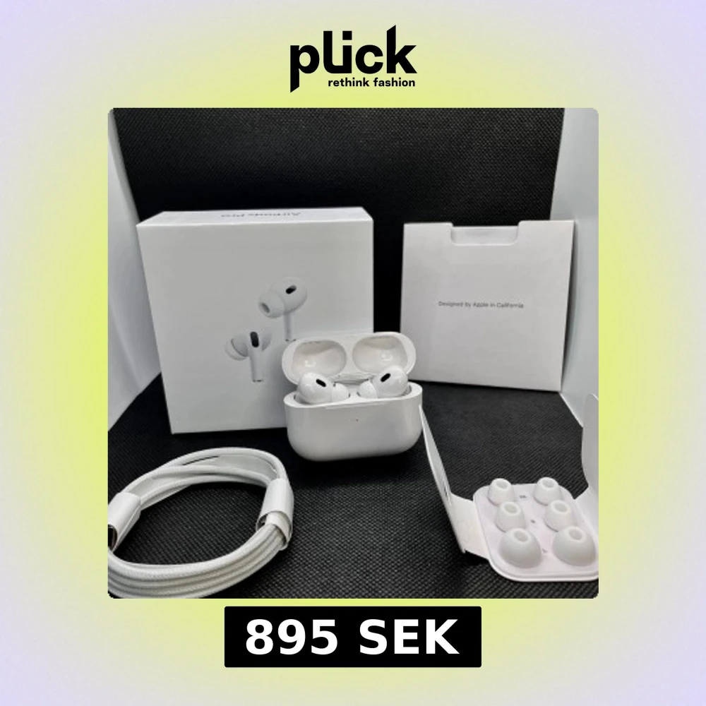 Apple AirPods Pro trådlösa hörlurar med aktiv brusreducering, laddningsetui, extra öronkuddar och USB-C kabel. Produkten ser ut att vara i mycket gott skick med originalförpackning och tillbehör inkluderade. Perfekt för musik, samtal och träning.