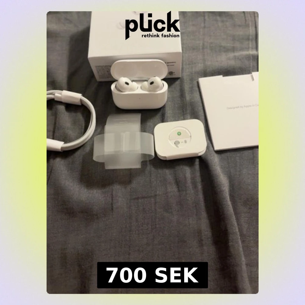 Apple AirPods Pro (2nd gen) i mycket fint skick, komplett med originalförpackning, laddningskabel, extra öronproppar och manual. Trådlösa hörlurar med aktiv brusreducering och laddningsetui. Inga synliga defekter eller slitage.