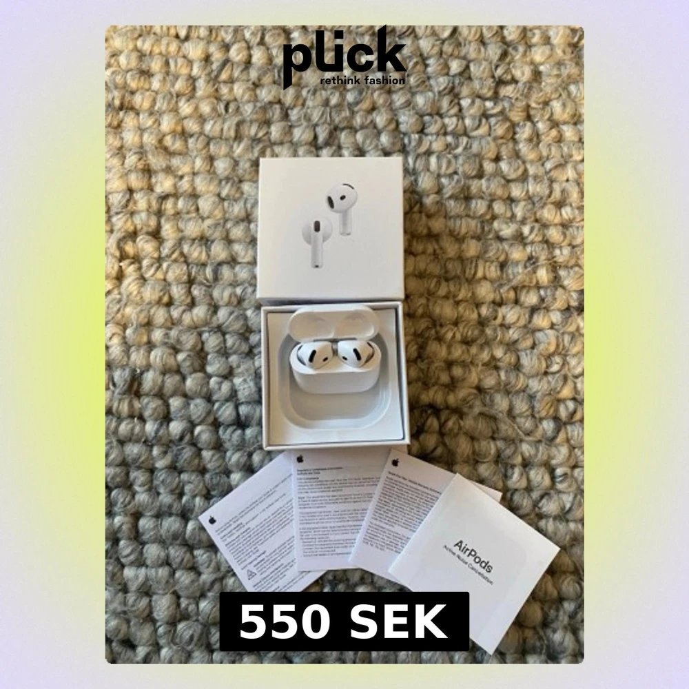 Snygga och moderna Apple AirPods 4. Komplett med förpackning och manualer. Hörlurarna och laddningsfodralet ser ut att vara i nyskick utan synligt slitage. Perfekt för trådlös musik med bra ljudkvalitet. Inte äkta