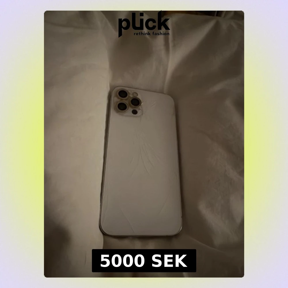 Säljer en iPhone 12 Pro i silver. Mobilen har tre kameralinser och LiDAR-sensor. Baksidan är sprucken med tydliga sprickor, men kamerorna ser hela ut. Skärmen ser ut att vara i bra skick utan synliga sprickor. Perfekt för dig som vill ha en kraftfull iPhone till ett bra pris.