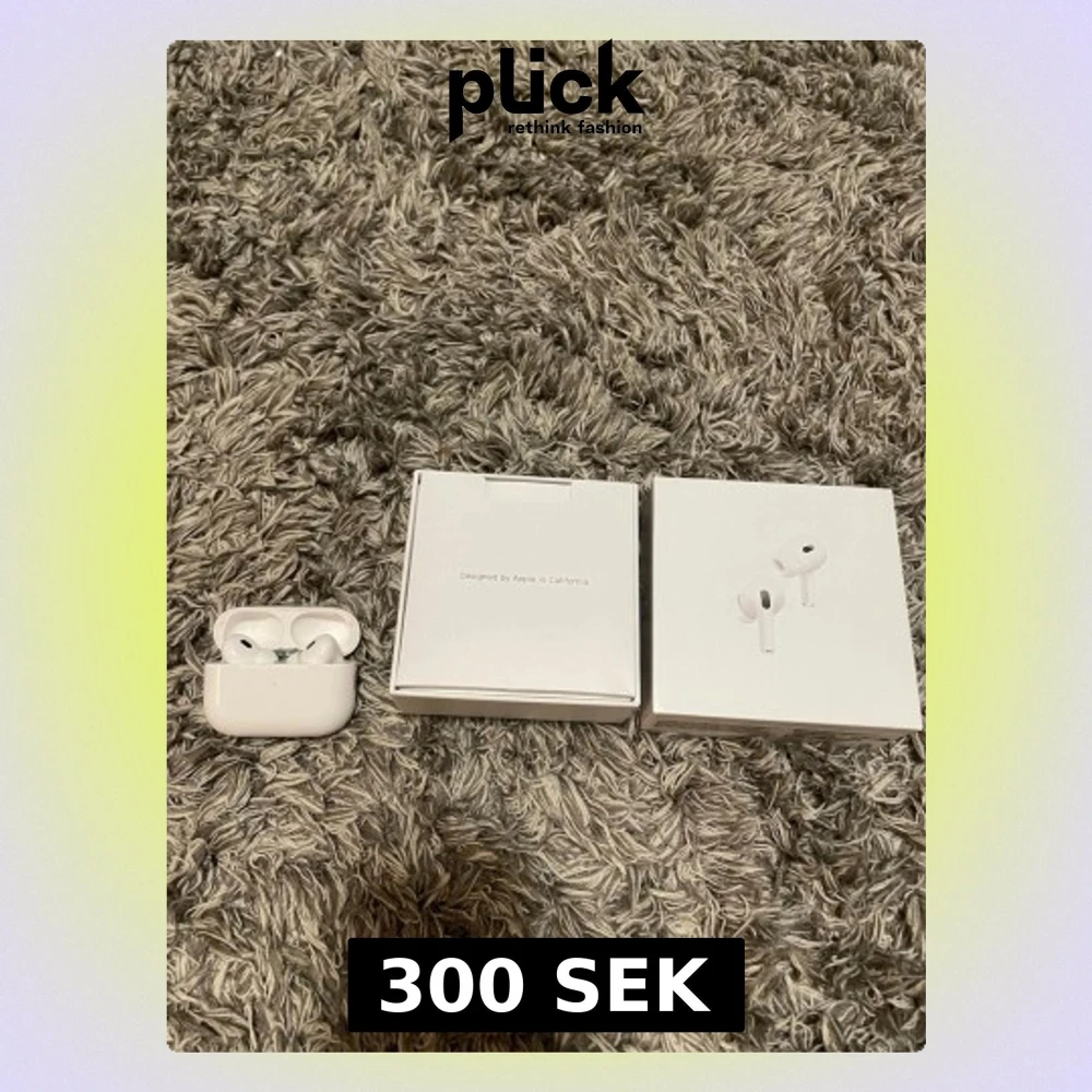 Apple AirPods Pro med originalförpackning och extra öronkuddar. Hörlurarna är trådlösa och har brusreducering vilket är toppen för musik och samtal. Allt fungerar bra, liten skada på hörlurskuddarna men tyvärr så fungerar inte själva skalet så den får man på köpet om man känner för att fixa den eller något annat, men båda airpodsen fungerar väldigt bra annars! (Kan diskutera pris och helst hämtning i Uppsala, kan mötas upp oxå)