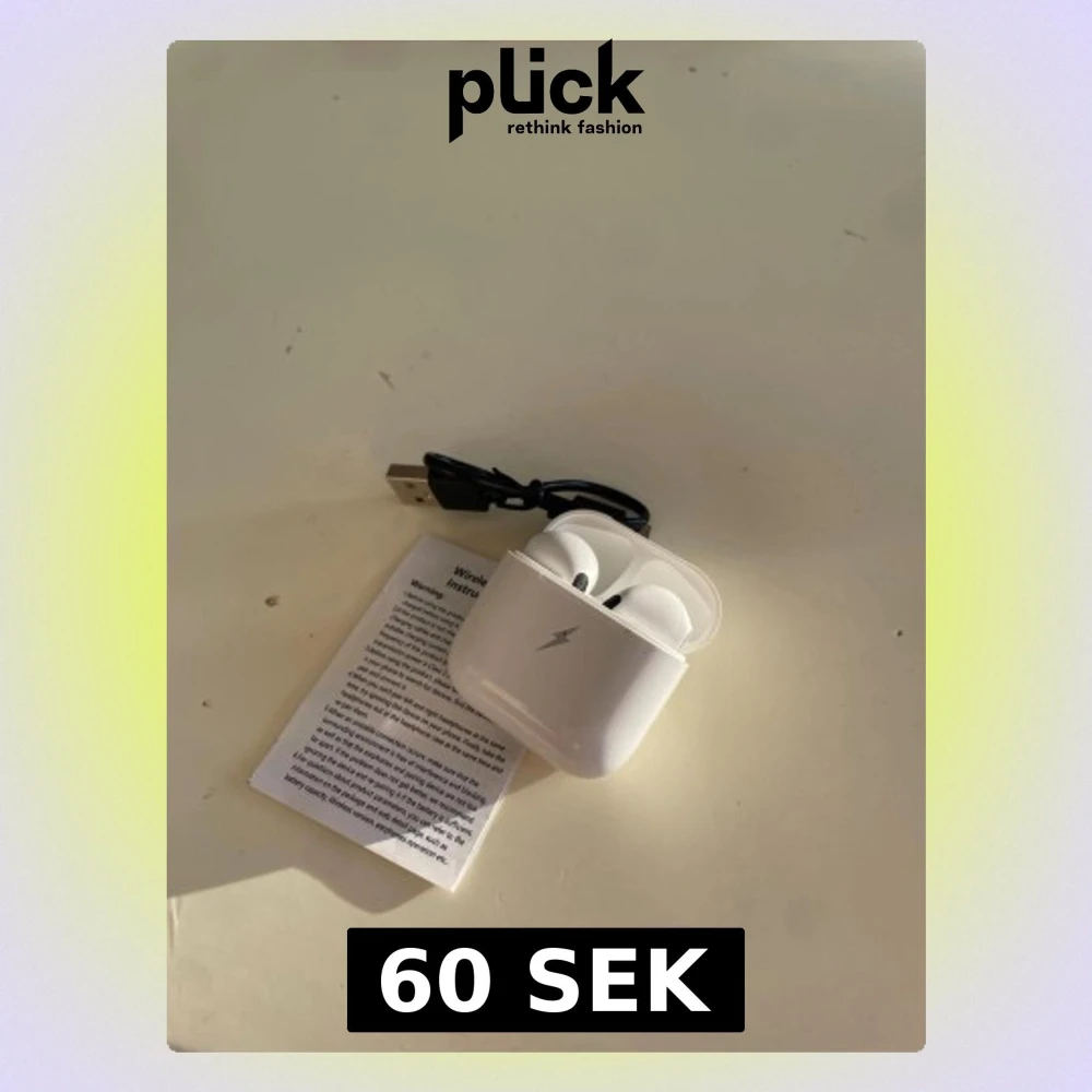 Snygga trådlösa hörlurar med laddningsetui, USB-laddkabel och instruktionsmanual. Hörlurarna är vita och har en modern design. Passar perfekt för musik och samtal. Produkten ser ut att vara i gott skick utan synligt slitage eller defekter.