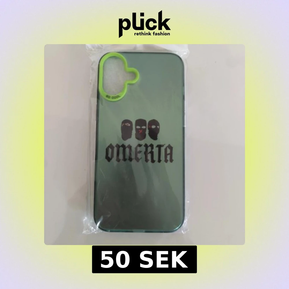 Snyggt och unikt Omerta-skal till iPhone, med motiv av tre maskerade ansikten och texten 'OMERTA'. Skalets kant är grön med texten 'SO COOL'. Produkten är ny och ligger i originalförpackning, utan synligt slitage eller defekter.