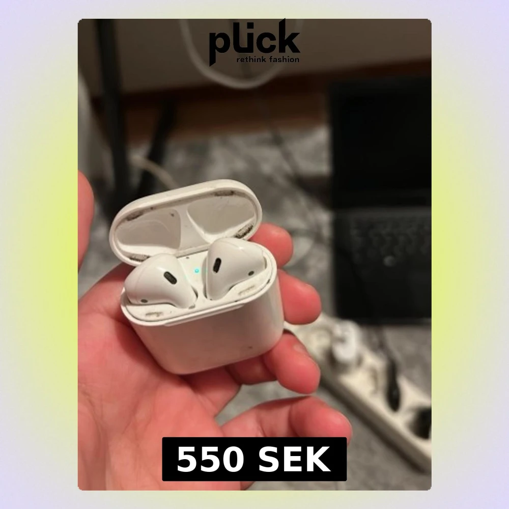 Apple AirPods med laddningsetui. Trådlösa hörlurar med enkel anslutning till iPhone. Skick: Synligt smuts och slitage på etui och insida, men fungerar. Perfekt för dig som vill ha prisvärda AirPods till vardagsbruk. Säljer dem för behöver pengar