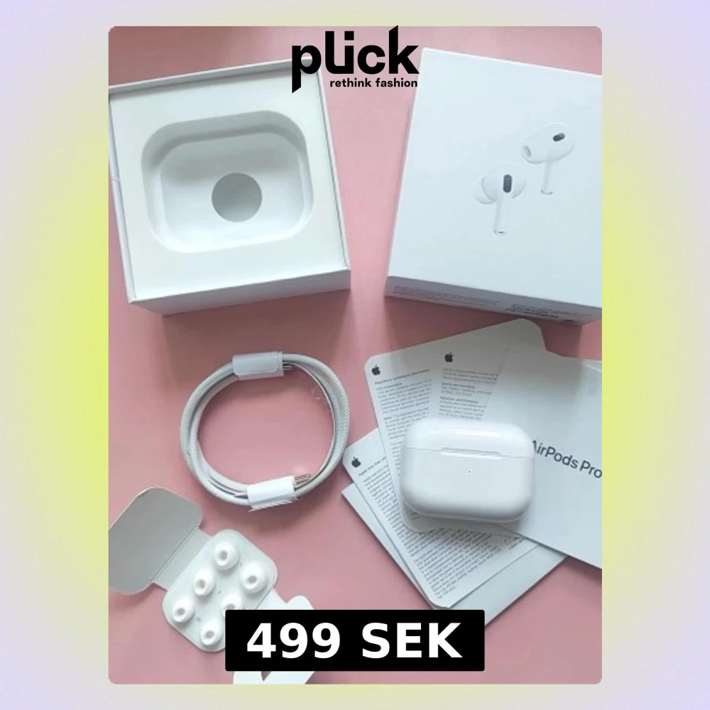 Apple AirPods Pro i mycket fint skick, komplett med originalkartong, laddningskabel, extra öronkuddar och manualer. Trådlösa hörlurar med aktiv brusreducering och laddningsetui. Perfekt för musik, samtal och träning. Inga synliga defekter eller slitage.