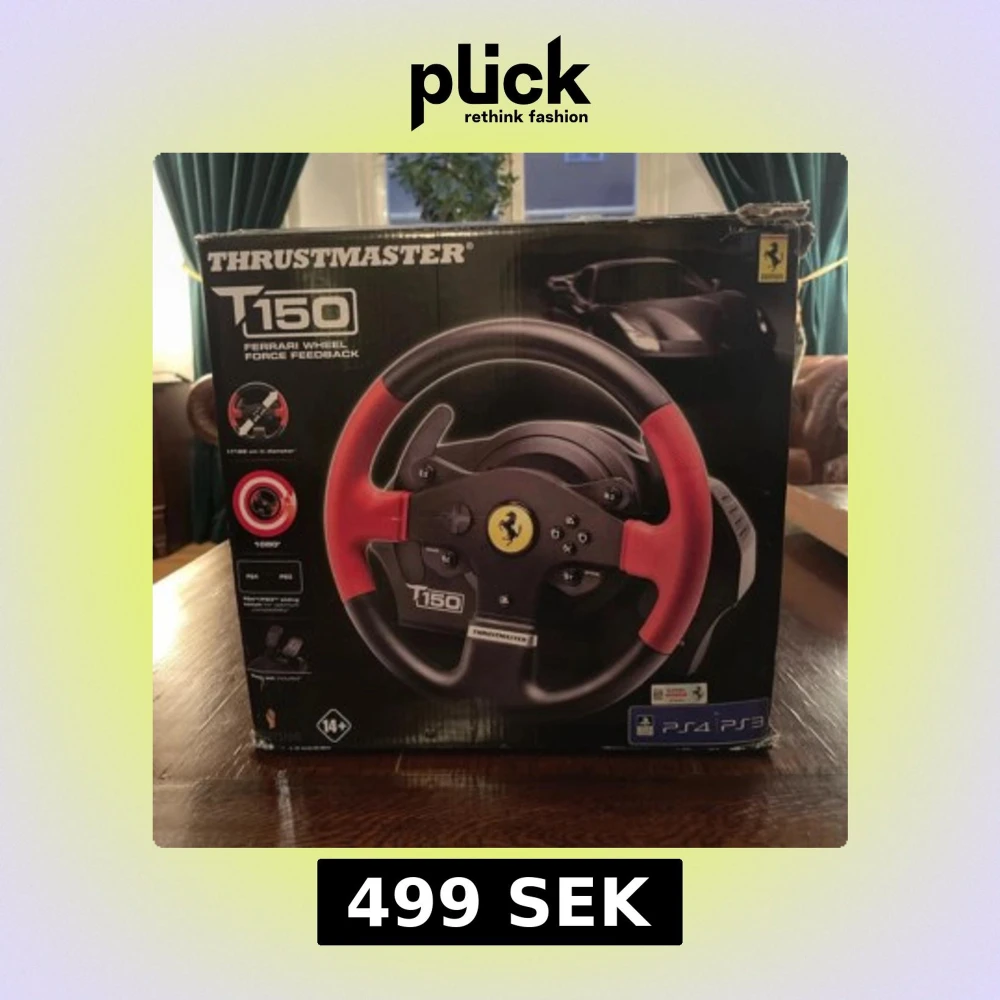 Thrustmaster T150 Ferrari ratt med force feedback för PS4/PS3. Inkluderar pedaler och kablar. Ratten har Ferrari-design och 1080° rotation. Kartongen har visst slitage men produkten ser ut att vara i gott skick.
