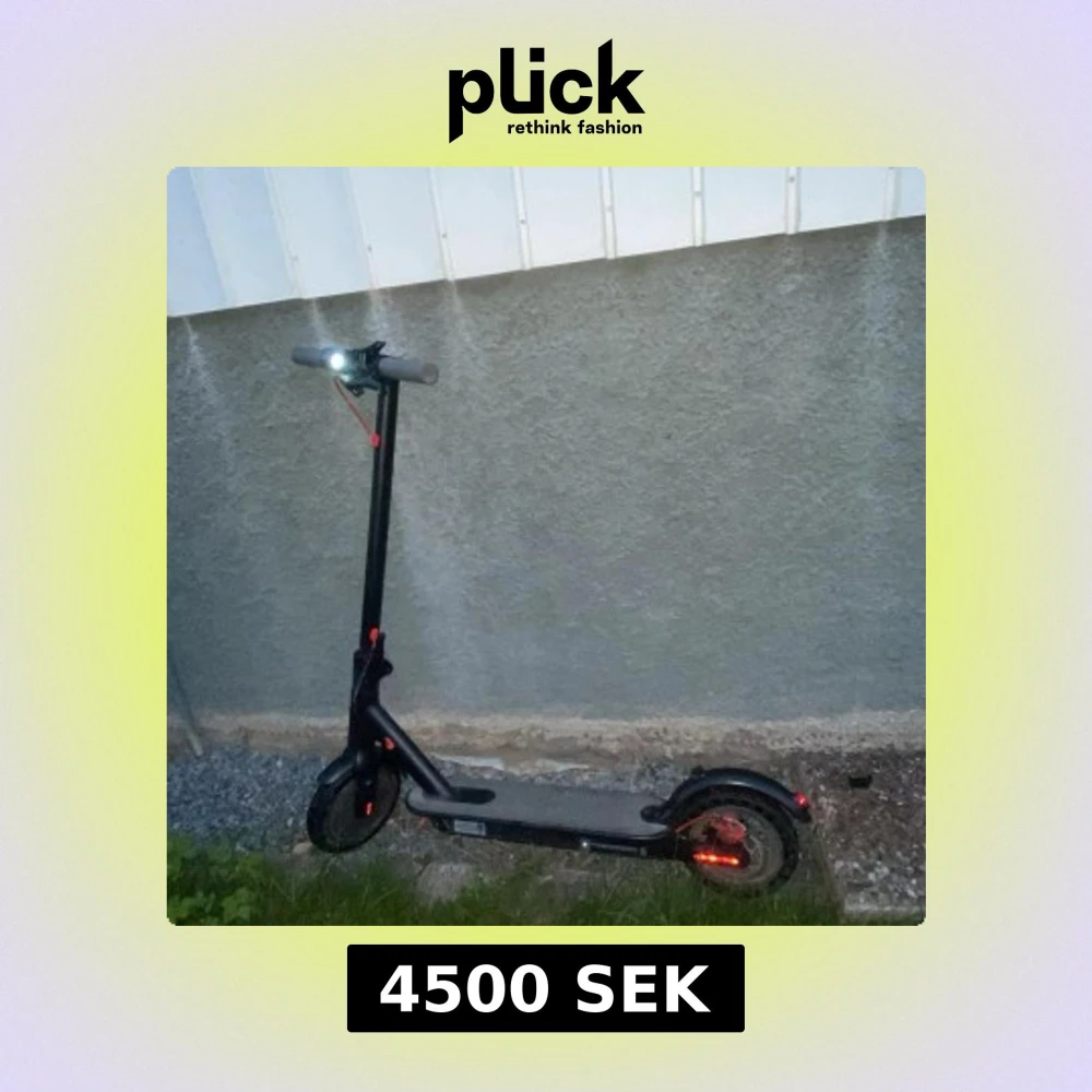 Stilren elscooter med digital display, LED-strålkastare och skivbroms bak. Grå handtag och robust ram. Viss smuts och normalt bruksslitage syns, men i gott skick. Perfekt för smidig och miljövänlig transport i stan.