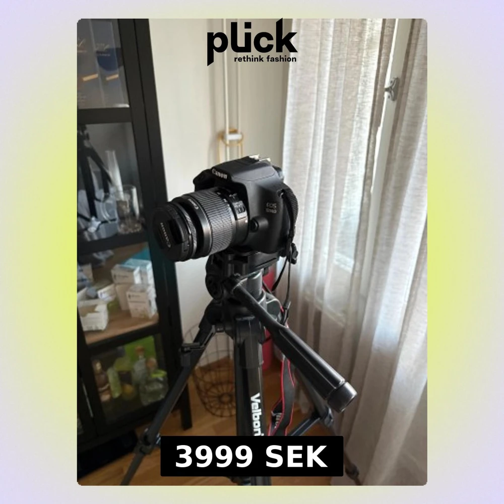 Canon DSLR-kamera med objektiv, extern blixt och stativ. Kameran är svart och levereras med ett zoomobjektiv monterat. Extern blixt av märket Nissin ingår för förbättrad belysning vid fotografering. Stativet är justerbart och används för stabilisering vid fotografering och videoinspelning. Nissin extern blixt Velbon DF-60 stativ. Pris kan diskuteras!