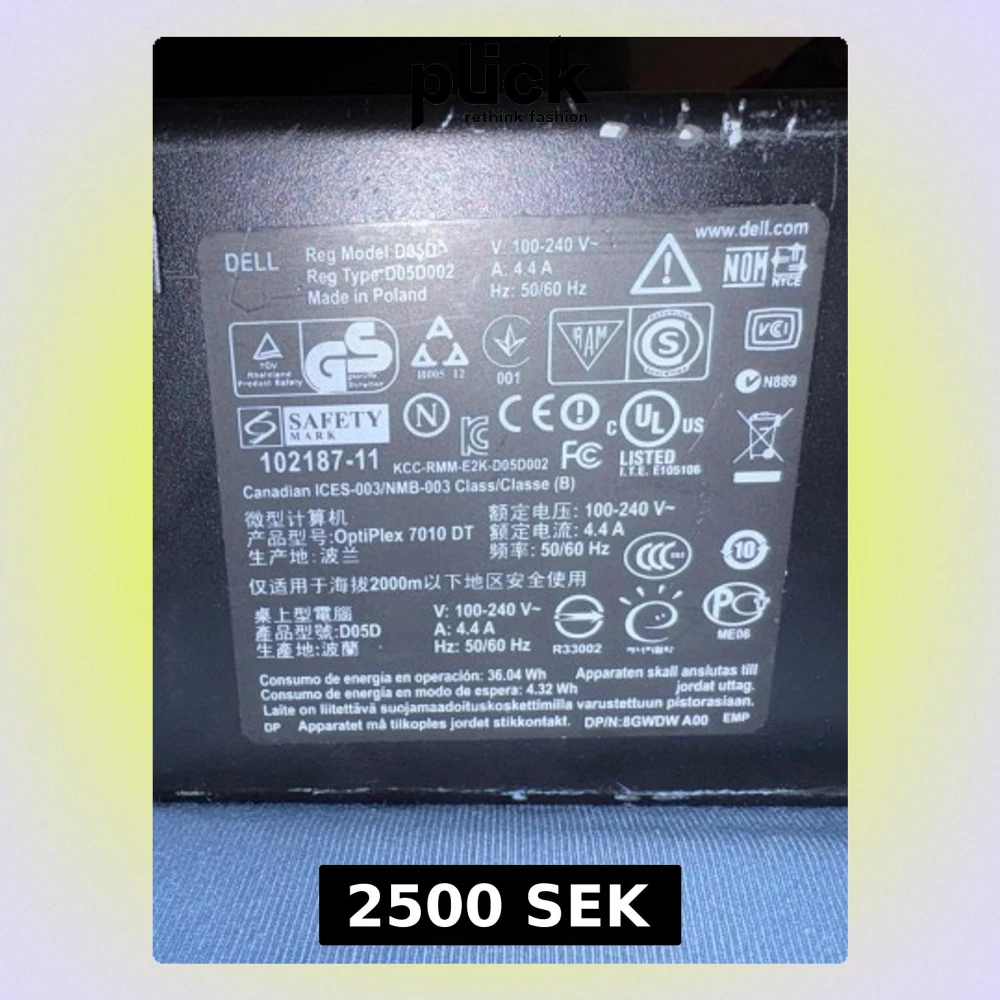Dell OptiPlex 7010 DT stationär dator med Intel Core i5, flera USB-portar och ljudutgångar. Märkbart yttre slitage och repor på chassit, samt färgskador. Perfekt för kontor eller enklare hemanvändning. Windows-märke synligt på fronten.