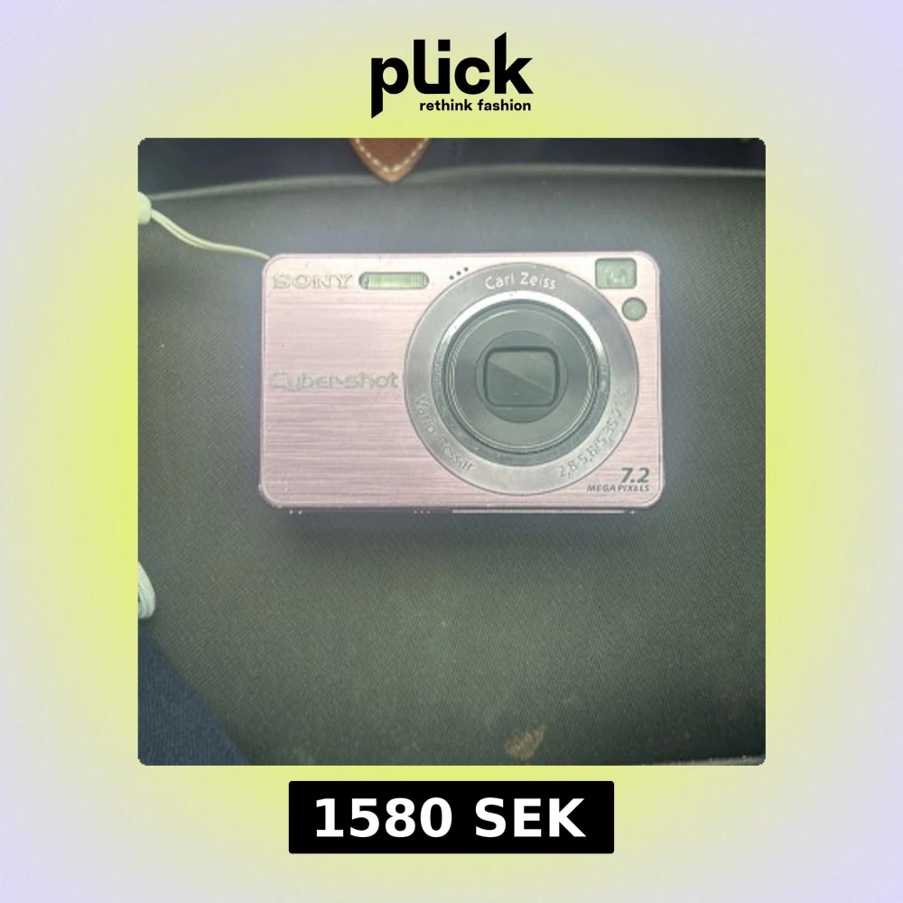 rosa Sony Cyber-shot DSC-W120 digitalkamera med Carl Zeiss Vario-Tessar lins, 7.2 megapixel och Super SteadyShot. Batteri (NP-BG1) och laddare medföljer. Skärmen har tydliga repor och slitage, men kameran är i övrigt i gott skick.