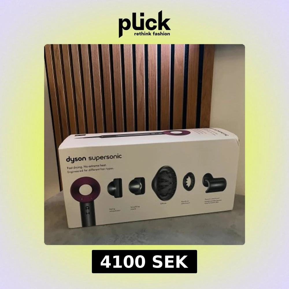 Dyson Supersonic hårfön i originalkartong med flera tillbehör: stylingkoncentrator, smoothing nozzle, diffuser, gentle air och flyaway attachment. Snabb torkning utan extrem värme. Helt Ny