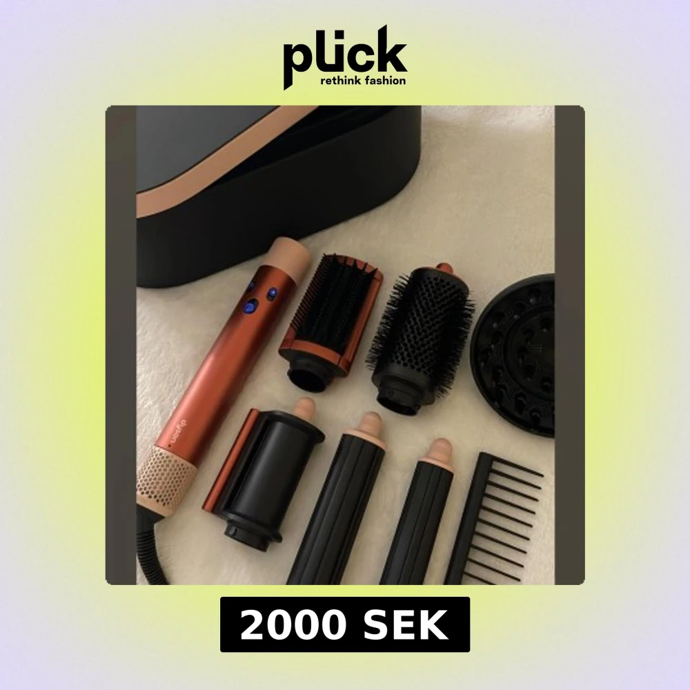 Dyson Airwrap slutsåld i koppar/roséguld med flera stylingtillbehör. Inkluderar borstar, locktillbehör och förvaringsbox. Säljer alla munstycken och boxen, inte själva fönhandtaget eller största rundborsten, men det går att köpa på exempelvis SHEIN för 200!