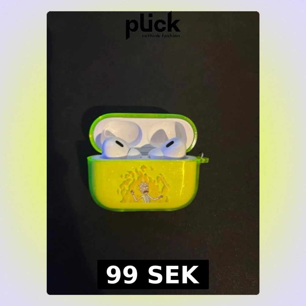Snygga AirPods Pro med aktiv brusreducering och trådlös laddning. Levereras med ett unikt Rick and Morty-skal i neonfärg som ger extra skydd och personlig stil. Hörlurarna och skalet ser ut att vara i gott skick utan synligt slitage eller repor.