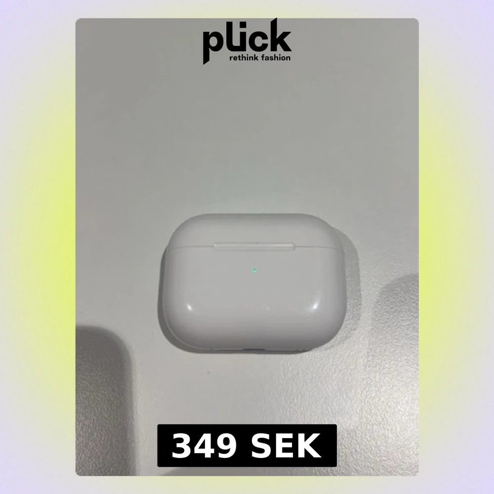 Säljer ett par vita Apple AirPods Pro med laddningsetui. De är kompakta, har en stilren design och sitter bekvämt i öronen. Perfekta för musik, poddar och samtal. Laddningsetuiet är i blank plast och har en liten LED-indikator på framsidan.