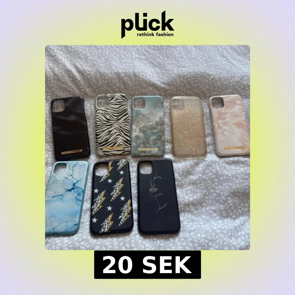 8 skal till iPhone 11, flera från iDeal of Sweden. Blandade mönster: zebra, marmor, hjärtan, blixtar och minimalistisk design. Skalen är i bra begagnat skick, vissa har mindre repor och slitage. Perfekt för dig som vill variera din stil! Jag säljer dessa 20 kronor styck eller allihopa för 100 kronor