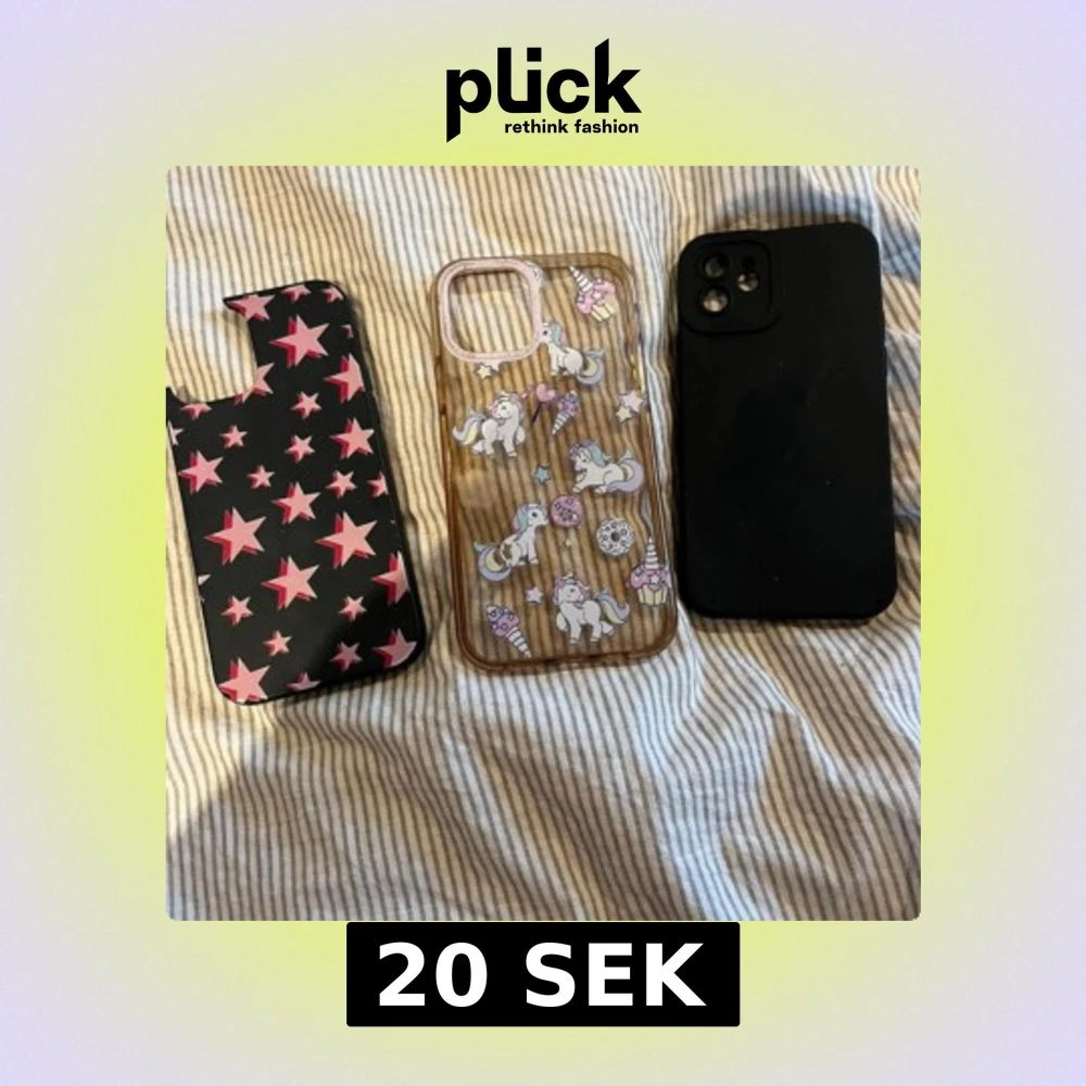 Tre skal till iPhone 12: ett svart med rosa stjärnor (skadat hörn), ett genomskinligt med enhörningar och ett helsvart skal. Passar iPhone 12, skyddar mot repor och stötar. Skalen är använda, ett har tydligt slitage, de andra i gott skick.