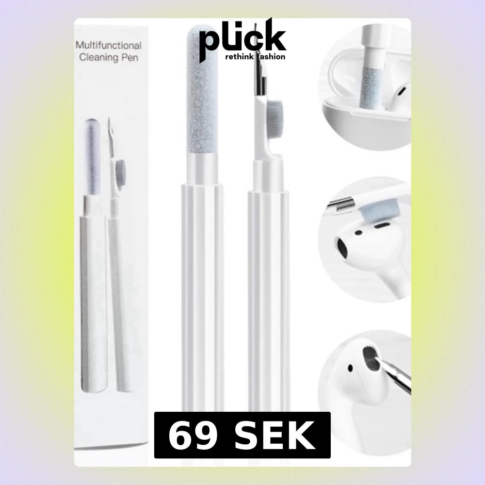 Praktisk rengöringspenna för hörlurar och elektronik. Innehåller borste, spets och svamp för effektiv rengöring av AirPods, laddningsfodral och små elektronikdelar. Perfekt för att ta bort smuts och damm. Produkten är i nyskick utan synligt slitage.