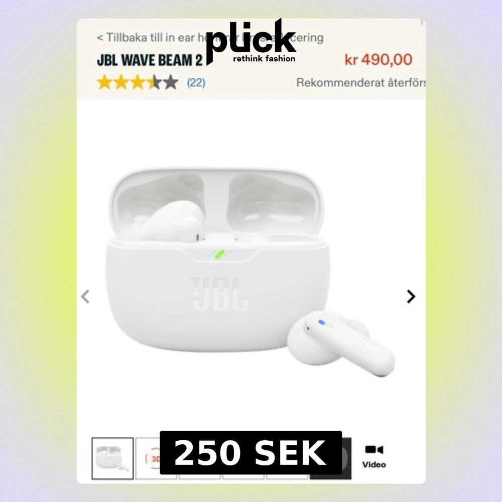 JBL Wave Beam 2 är trådlösa in-ear hörlurar med brusreducering och laddningsetui. Snygg vit design, kompakt och portabel. Passar perfekt för musik och samtal. Produkten ser ut att vara i mycket gott skick utan synligt slitage eller defekter.