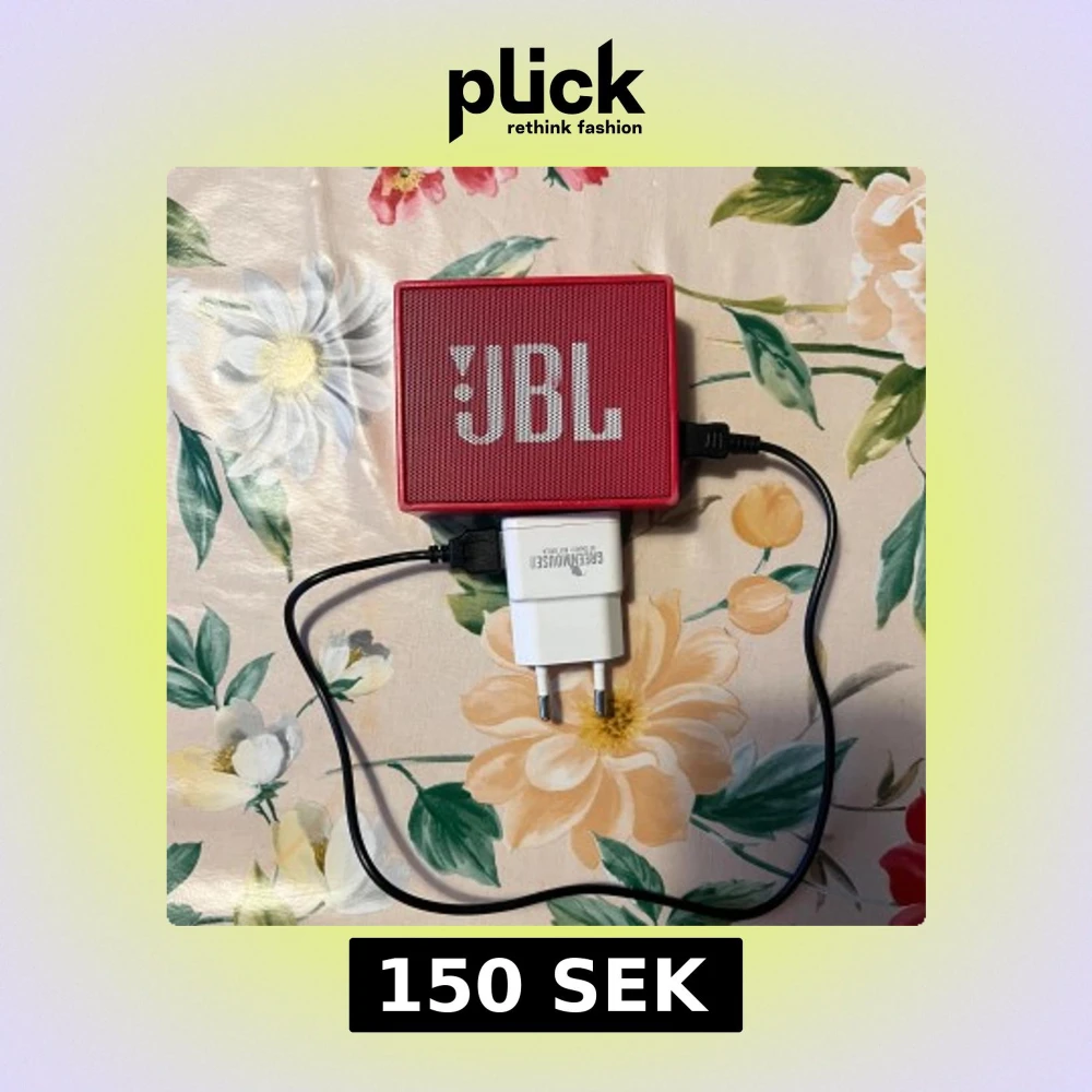Kompakt och portabel JBL GO Bluetooth-högtalare i rött. Levereras med laddkabel och USB-adapter. Högtalaren är i använd skick med synliga repor men den har fortfarande jätte bra ljud, perfekt för musik på språng eller hemma.