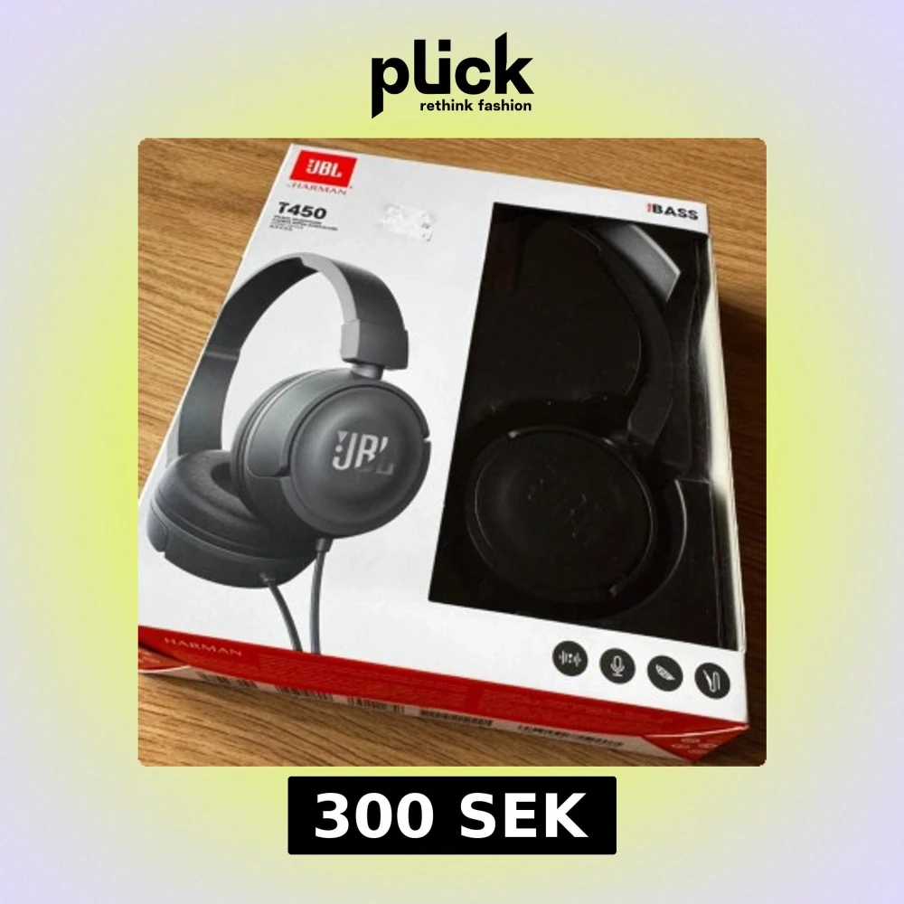 JBL T450 är lätta, hopfällbara over-ear hörlurar med JBL Pure Bass-ljud, inbyggd mikrofon och fjärrkontroll. Kabeln är platt och trasselfri. Produkten är i originalförpackning och ser oanvänd ut, perfekt för musik och samtal på språng.