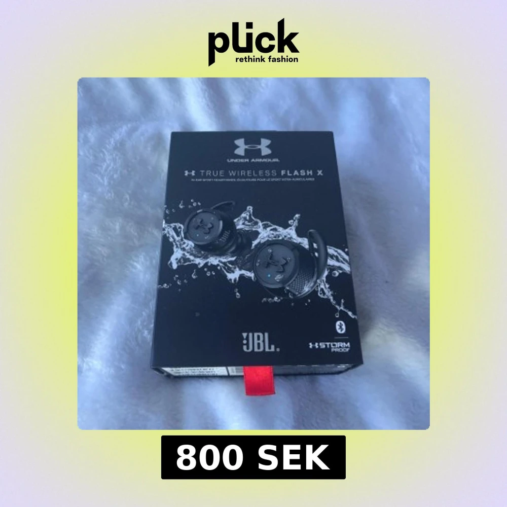 Snygga och robusta trådlösa sporthörlurar från JBL och Under Armour. Bluetooth, vattentåliga (Stormproof), perfekt för träning. Komplett med originalförpackning och laddningsetui. Hörlurarna och etuiet ser ut att vara i mycket gott skick utan synligt slitage.