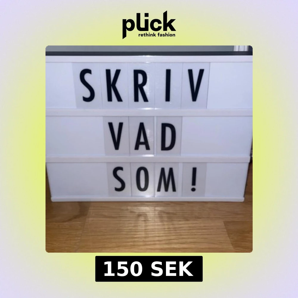 Stilren LED lightbox med utbytbara bokstäver för personliga meddelanden. Har AV och PÅ knappar. Levereras med ett komplett set bokstäver och tecken. Fint skick, inga synliga defekter eller slitage. Tyvärr är sladden borta men super lätt att få tag på!❤️💕