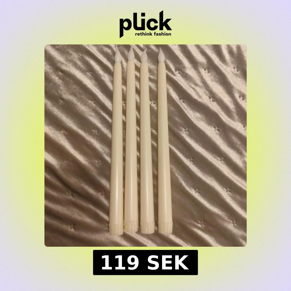 Bilden visar fyra elektriska LED-ljus i form av stearinljus. De är vita med en låga i plast och passar perfekt för dekoration eller stämningsbelysning. Ljusen ser ut att vara i gott skick utan synligt slitage. Batteridrivna och säkra alternativ till vanliga ljus.
