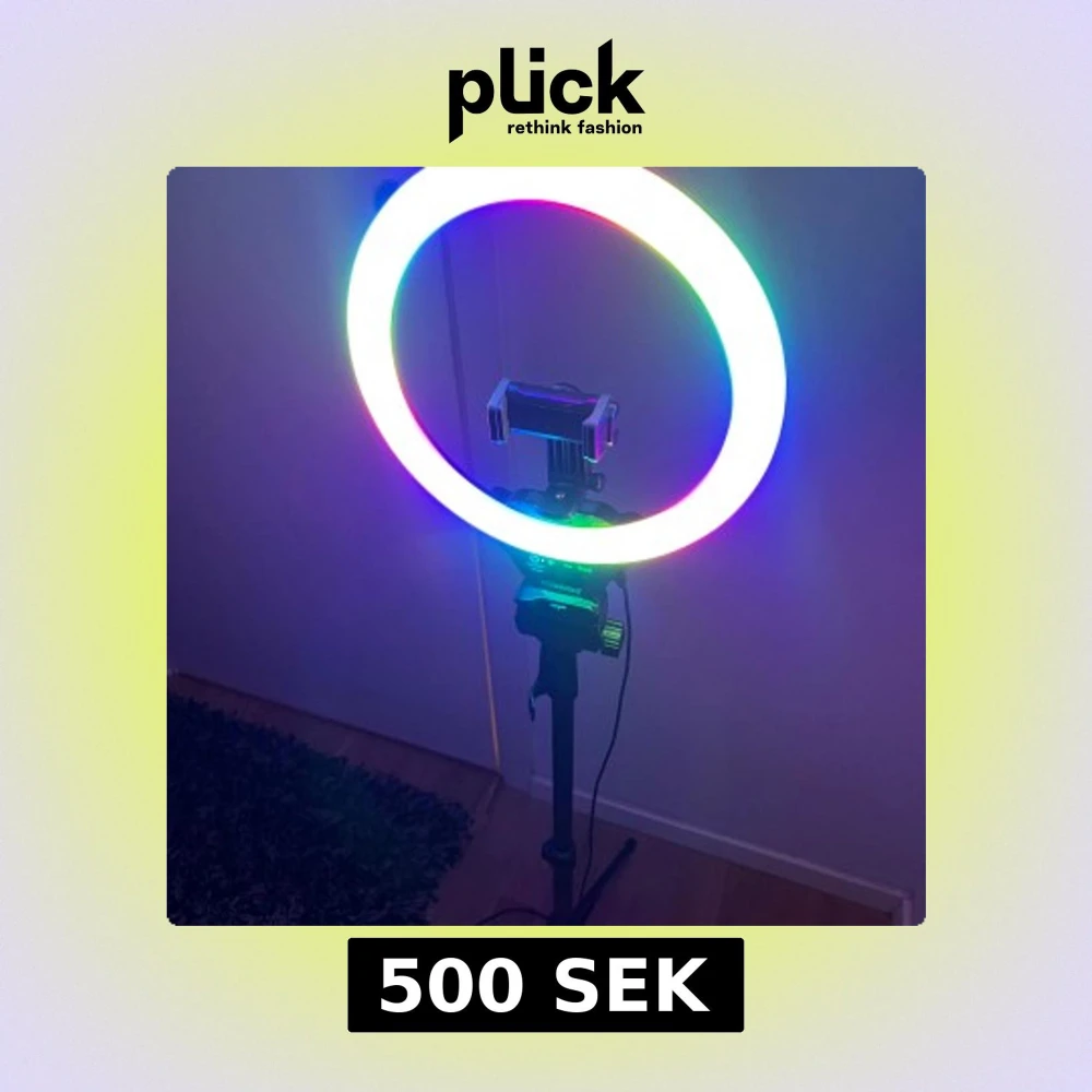RGB ring light med justerbart stativ och mobilhållare. Flera ljuslägen, inklusive färgade och vitt ljus. Fjärrkontroll för iOS/Android medföljer. Perfekt för foto, video och streaming. Mycket fint skick, inga synliga defekter.