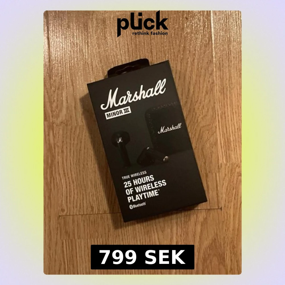 Helt nyinköpta Marshall Minor III true wireless hörlurar i oöppnad orginalförpackning. Säljes för 799. Orginalpris: ca 900kr 25 timmars trådlös speltid. Bluetooth 5.2. Färg: svart