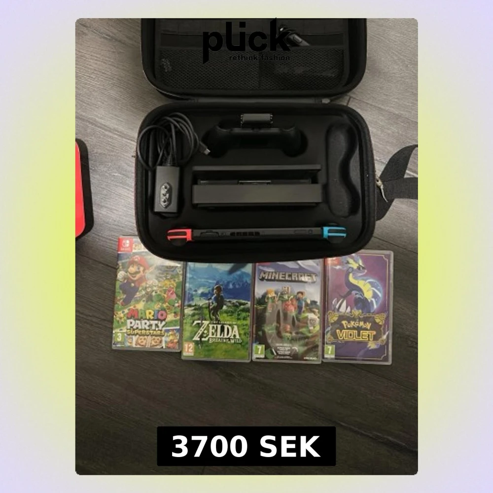 Nintendo Switch med blå och röd Joy-Con, originalförpackning, laddare, dockningsstation och bärväska. Fyra populära spel ingår: Mario Party Superstars, Zelda: Breath of the Wild, Minecraft och Pokémon Violet. Konsolen och tillbehören ser ut att vara i gott skick utan synligt slitage.