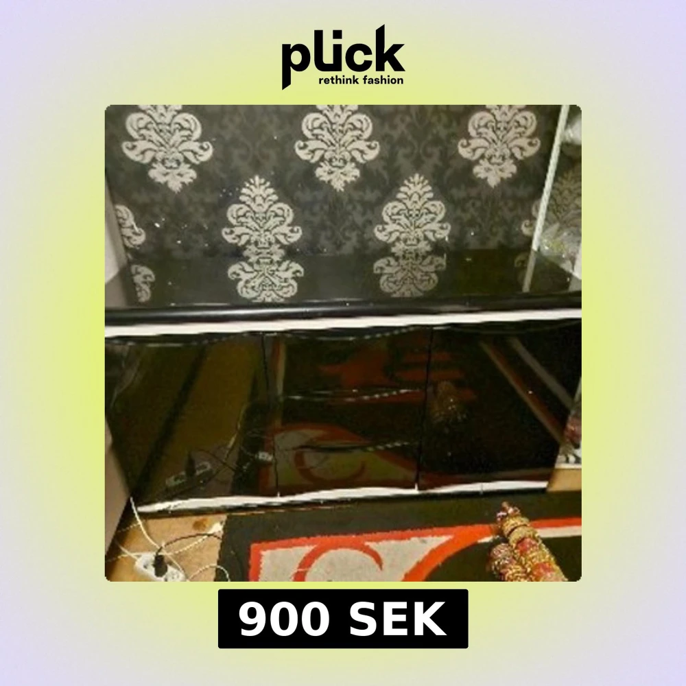 Bilderna visar en svart, glansig TV-bänk eller mediabänk med flera lådor och skåp. Produkten har en modern design och ser ut att vara i gott skick, utan synliga repor eller skador. Perfekt för att organisera elektronik och tillbehör i vardagsrummet.