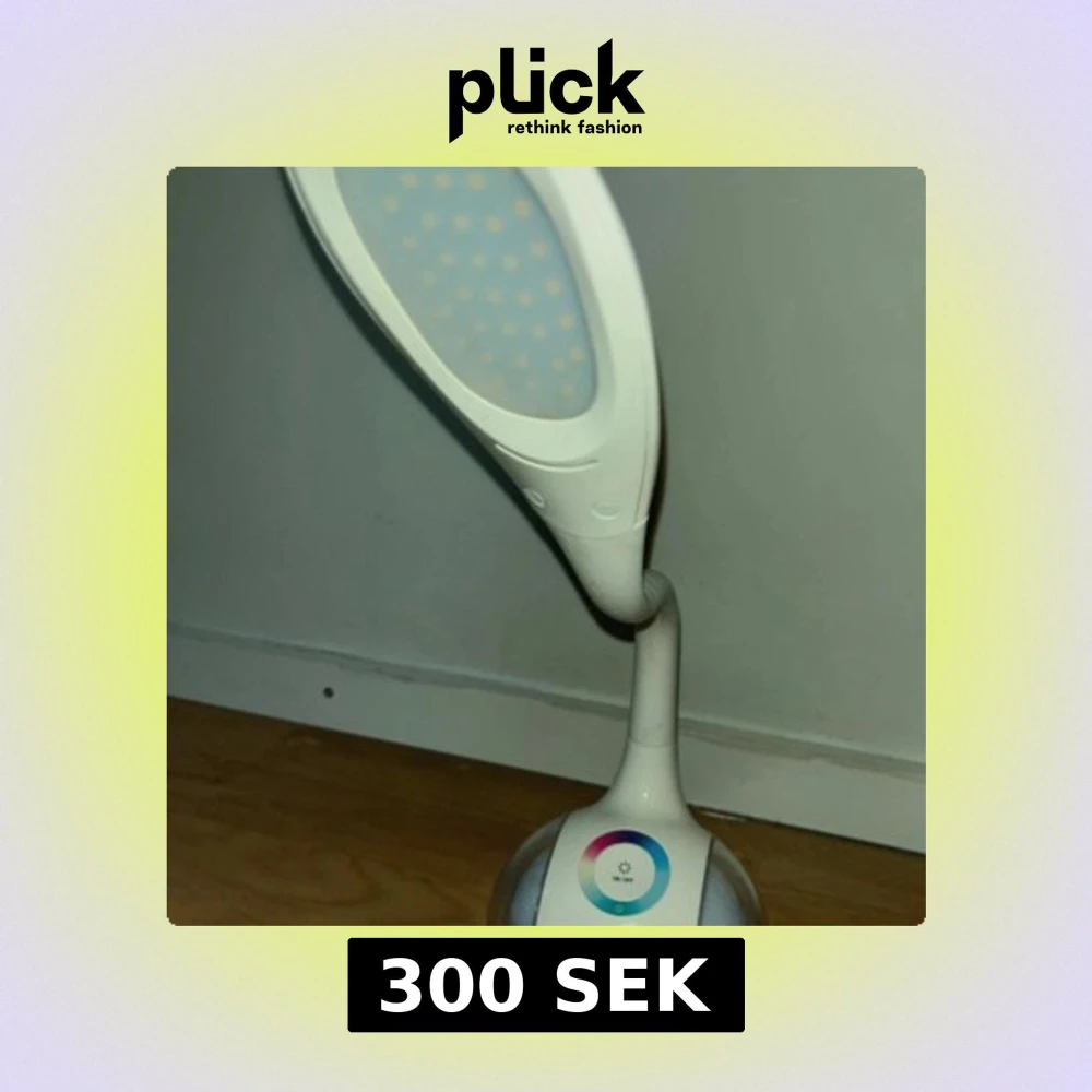 Modern LED skrivbordslampa med flexibel arm och touchkontroll. Basen har inbyggd färgskiftande belysning som kan justeras. Lampan levereras med strömadapter. Mindre bruksspår syns, men fungerar utmärkt. Perfekt för skrivbord eller nattduksbord.