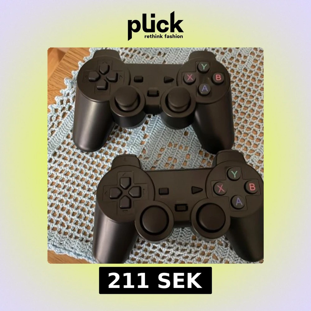 Två svarta trådlösa spelkontroller i DualShock-stil, Kontrollerna har XYAB-knappar och dubbla joysticks. Helt nya det år så man får dem så inget HDMI