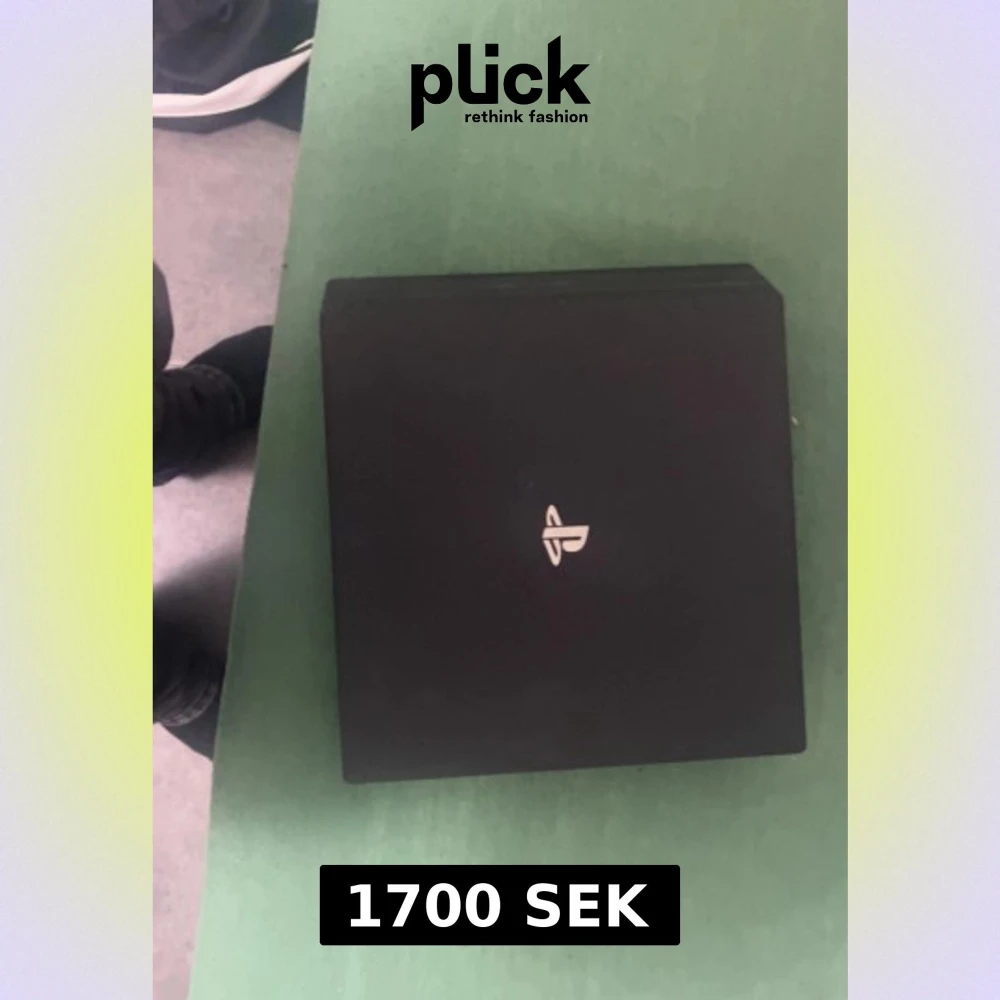 Snygg och kraftfull PlayStation 4 Pro i svart. Konsolen har tre USB-portar, HDMI och nätverksanslutning. Ytan ser välvårdad ut och har ingen kontroll bara självaste konsolen o sladd