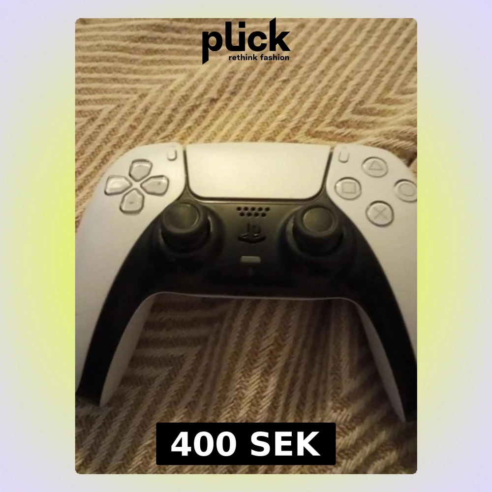 DualSense trådlös handkontroll till PlayStation 5 i vitt och svart. Ergonomisk design, adaptiva triggers och inbyggd mikrofon. Kontrollen ser ut att vara i gott skick utan synliga skador eller större slitage.