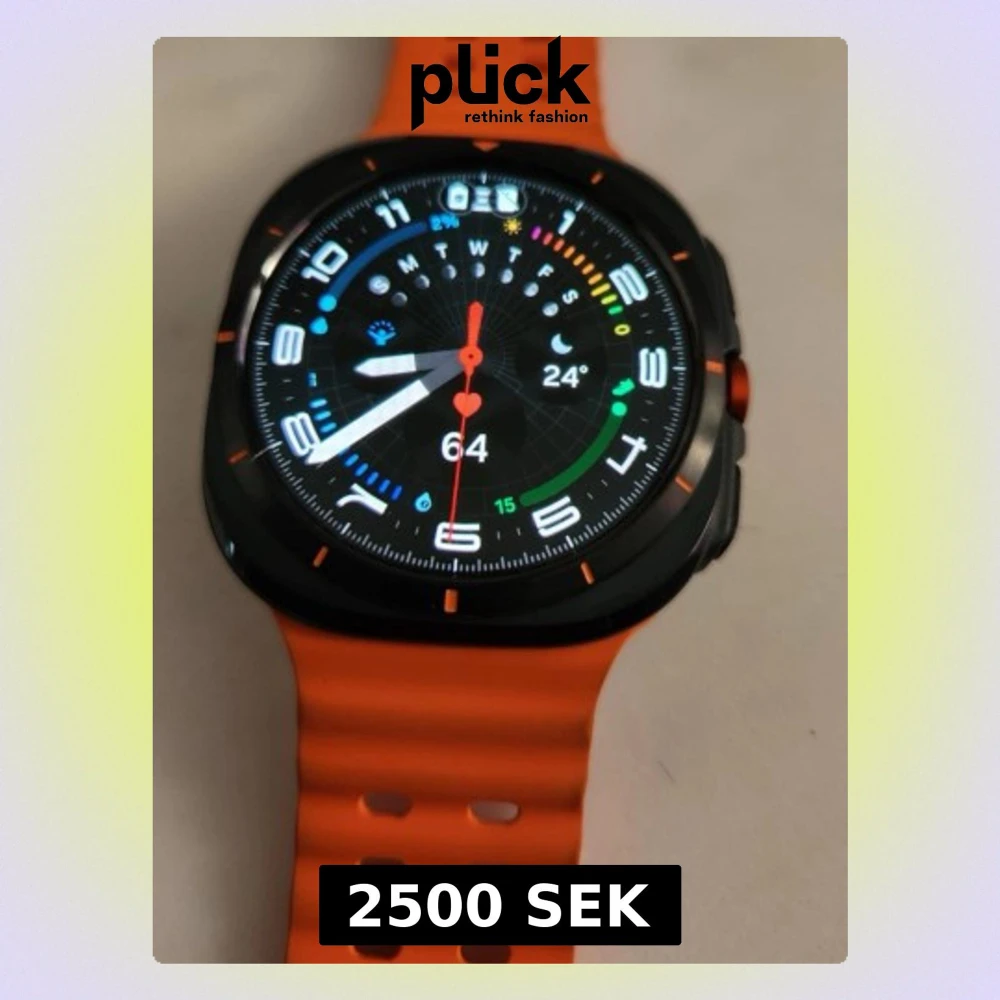 Samsung Galaxy Watch Ultra med orange sportarmband. Smartklockan har en robust design, tydlig AMOLED-skärm och avancerade hälsofunktioner som pulsmätning och vädervisning. Skicket ser utmärkt ut utan synligt slitage. Perfekt för träning och vardagsbruk.