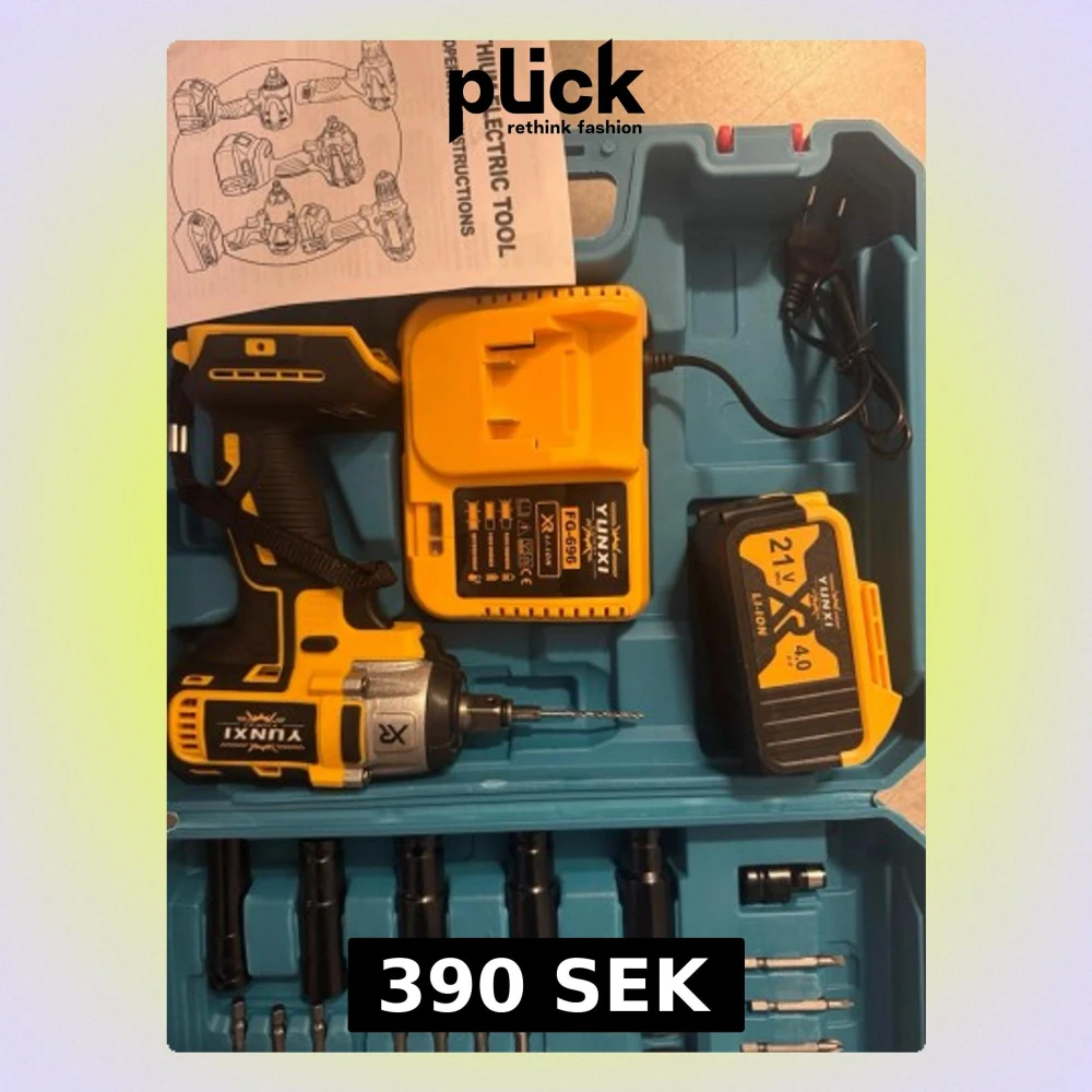 Slagborrmaskin med batteri och laddare. Inkluderar diverse bits och tillbehör.