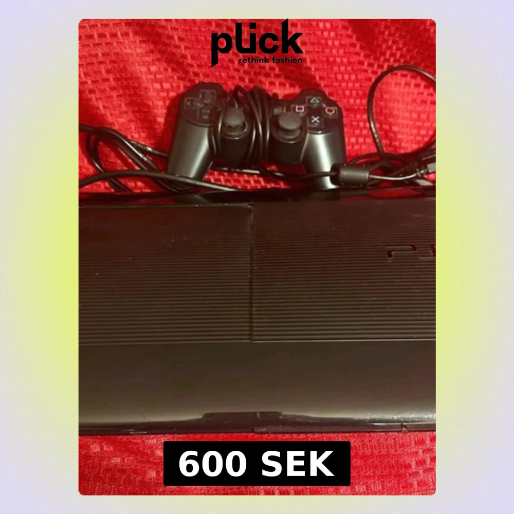 Sony PlayStation 3 Super Slim med en originalkontroller och kablar. Konsolen har några synliga repor och mindre slitage på ytan, men är i gott skick. Diskfacket fungerar och alla knappar på kontroller ser hela ut. Perfekt för spel och multimedia.
