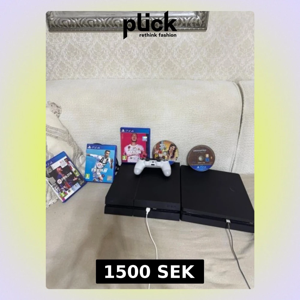 PlayStation 4 Slim i bra skick, och en vanlig PlayStation 4 med en vit DualShock 4-kontroll och populära spel: FIFA 19, FIFA 20, FIFA 21, Uncharted 4 och GTA V. Konsolen och kontrollen visar normalt bruksslitage men fungerar utmärkt. Perfekt för spelkvällar och underhållning.