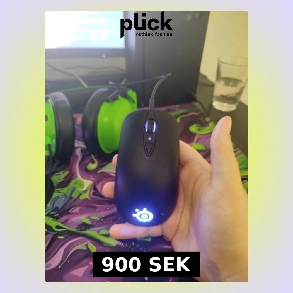 SteelSeries Sensei gamingmus med kabel, ergonomisk design och programmerbara sidoknappar. LED-belysning på logotypen. Musen är i gott skick med mindre ytliga repor, fungerar utmärkt för gaming och arbete.