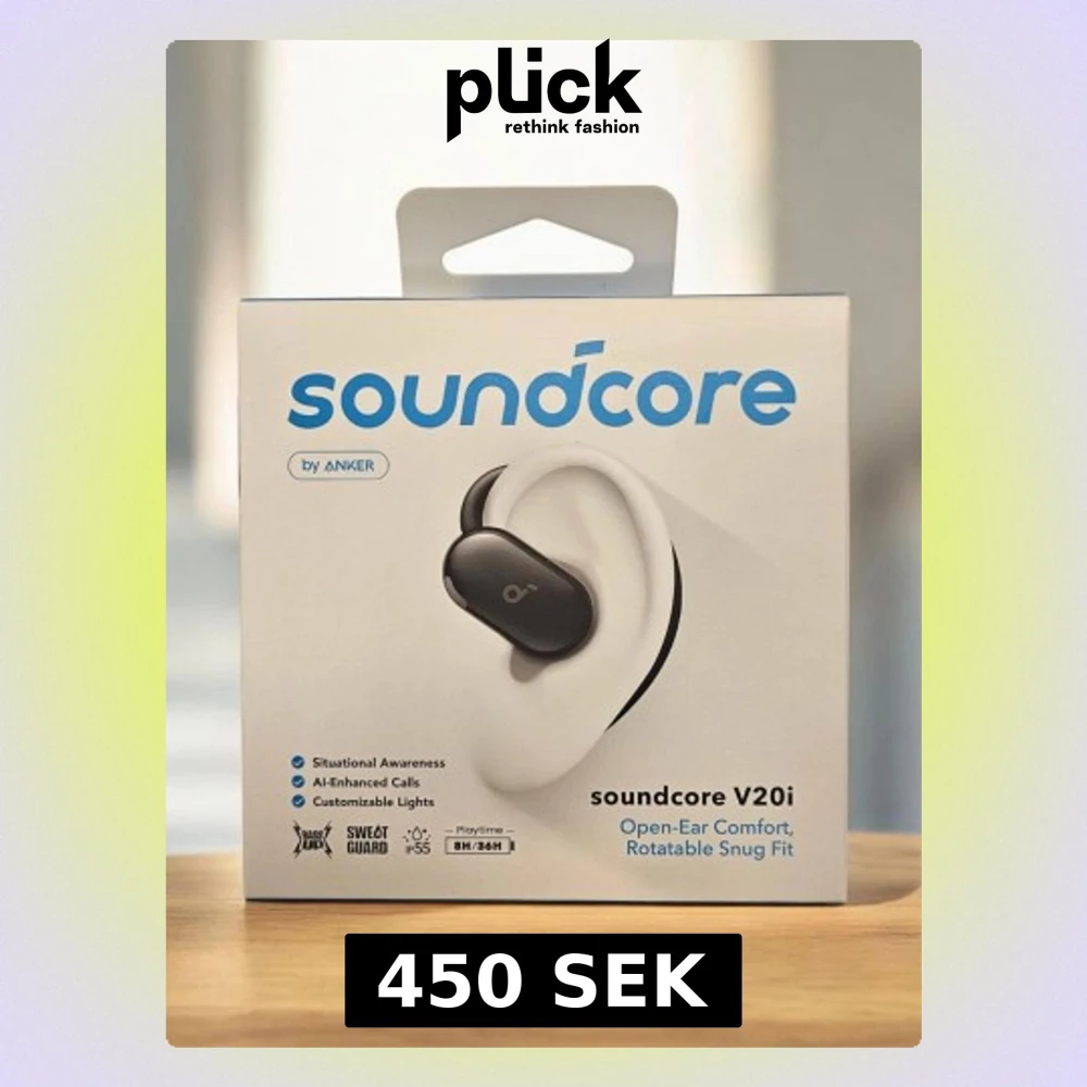 Säljer ett par Soundcore V20i från Anker. Dessa är öppna öronsnäckor, vilket innebär att de sitter utanför hörselgången för bättre komfort och medvetenhet.Viktiga specifikationer:Justerbar passform: 4 olika positioner för en säker passform.Ljud: 16 mm element för bättre bas.Batteri: 8 timmars speltid (totalt 36 timmar med laddningsfodral).Hållbarhet: IP55 vattentålig och SweatGuard.Förpackningen