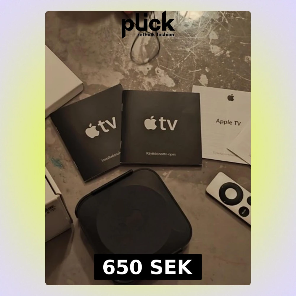 Apple TV (Model A1469) med fjärrkontroll och originalmanualer. Stöd för 1080p HD, HDMI och 802.11n Wi-Fi. Enheten och tillbehör ser ut att vara i gott skick, inga synliga defekter eller större slitage. Perfekt för streaming av filmer, serier och musik.