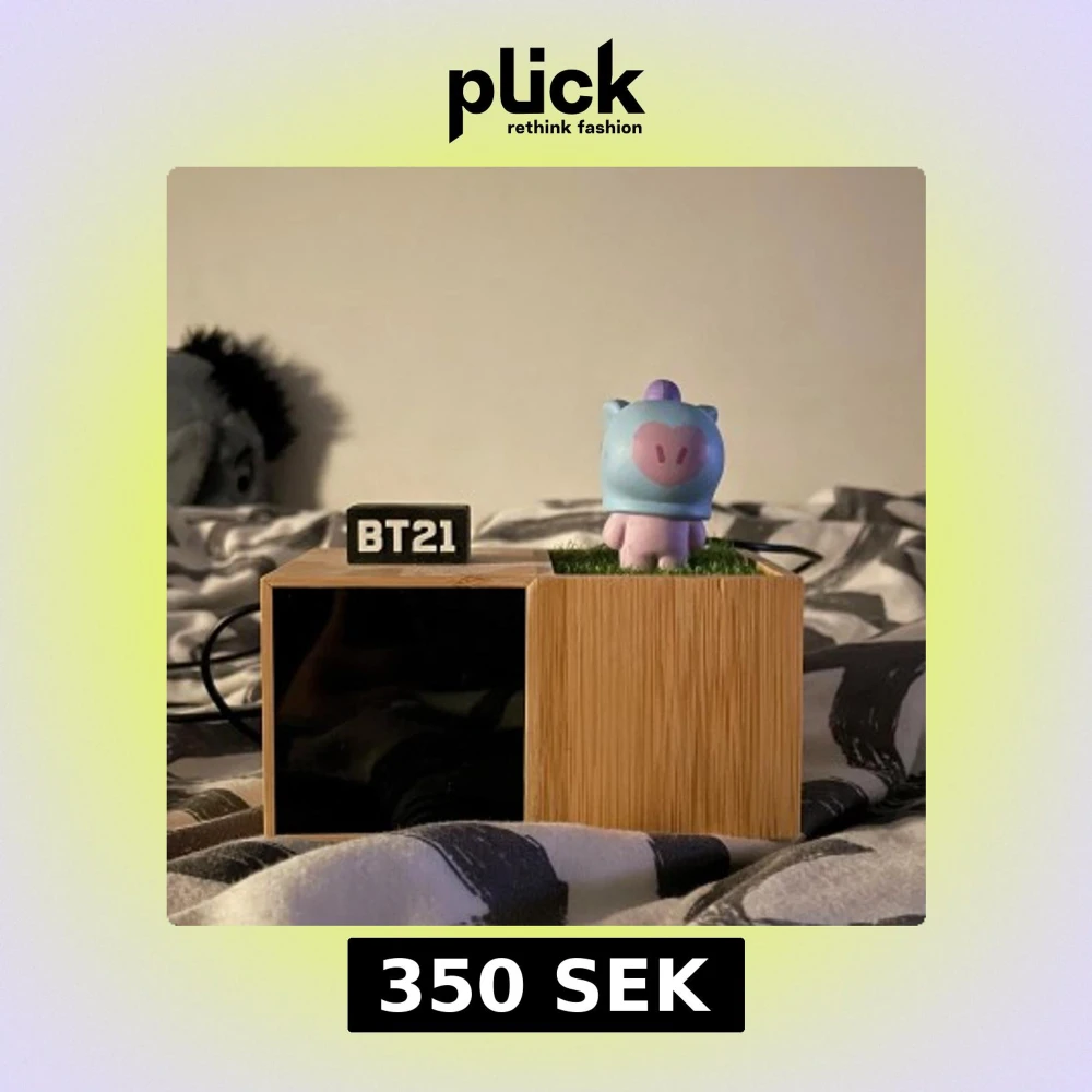 Snygg digital väckarklocka med BT21 Mang-figur. Klockan har en modern design i trä och svart, med konstgräs och USB-anslutning. Fungerar som alarmklocka och dekoration. Gott skick, mindre ytslitage kan förekomma. Perfekt för fans av BT21 och K-pop. Nypris: 500kr