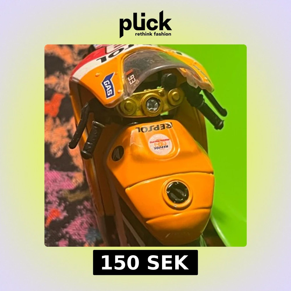 Detaljerad modell av Repsol Honda MotoGP motorcykel med autentiska dekaler och färger. Orange fälgar, Bridgestone-däck och GAS-sponsring. Skicket är mycket bra, inga synliga skador eller slitage. Perfekt för samlare eller som dekoration.