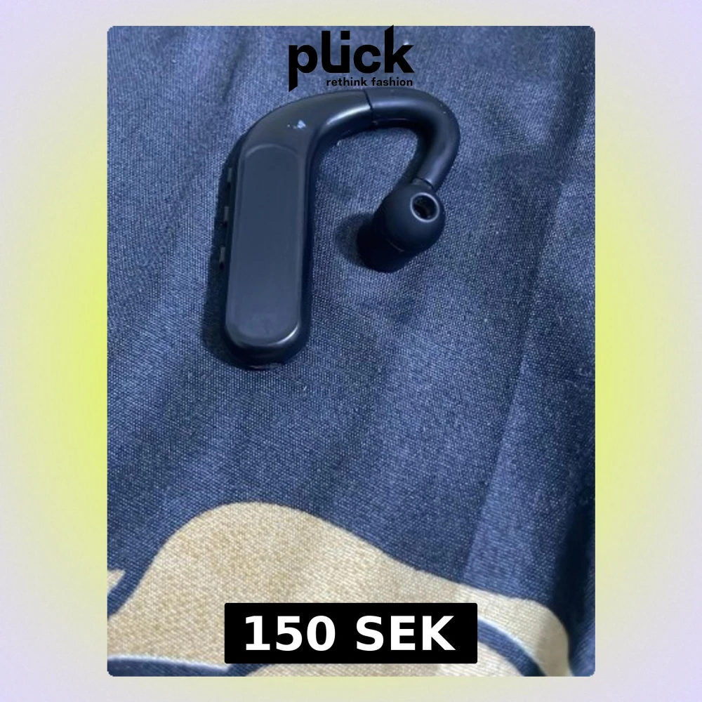 Trådlös Bluetooth mono-headset med öronkrok, perfekt för handsfree-samtal. Svart färg, synligt i gott skick med mindre slitage på ytan. Bekväm passform och enkel kontroll via knappar på sidan. Passar både arbete och bilkörning.