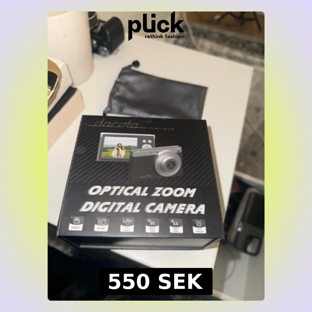 Dacota Platinum digitalkamera med 16MP, 1080p video, 3x optisk zoom, 5x digital zoom, ansiktsigenkänning och anti-skak. Levereras med batteri, minneskort och skyddspåse. Kameran är i gott skick och fungerar utmärkt.