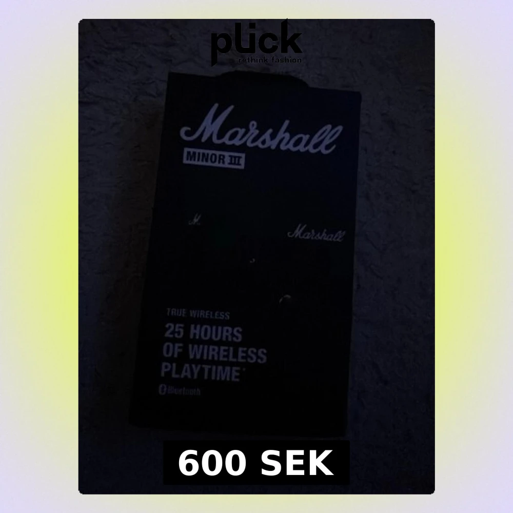 Marshall Minor III är trådlösa hörlurar med upp till 25 timmars batteritid och Bluetooth-stöd. Snygg design och ikoniskt Marshall-ljud. Förpackningen ser ut att vara i gott skick utan synliga skador eller slitage.