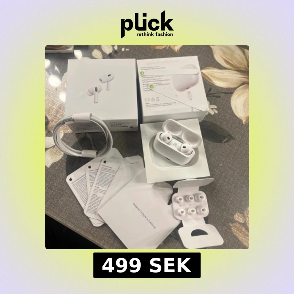 AirPods Pro 2 - Apple AirPods Pro 2 med laddningsetui, extra öronkuddar och laddningskabel. Produkten ser ut att vara i mycket gott skick utan synligt slitage. Aktiv brusreducering och trådlös anslutning för bästa ljudupplevelse. Perfekt för musik, samtal och träning.